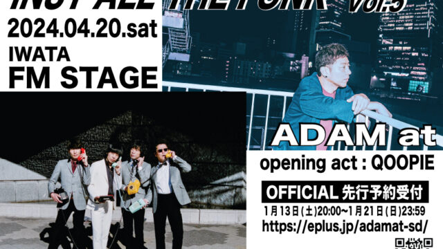 2024年4月20日 / 最終更新日時 : 2025年10月26日 HIDEYAN NEWS ADAM at「INSTALL THE FUNK vol.5」 24.04.20(土)「INSTALL THE FUNK vol.5」 [会場] 磐田FM STAGE 17:00 OPEN / 17:30 START [出演] SCOOBIE DO / ADAM at [O.A.] […]