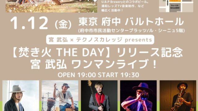 2024年1月4日 / 最終更新日時 : 2025年10月26日 HIDEYAN NEWS 府中バルトホール 宮 武弘 × テクノスカレッジ presents 「【焚き火 THE DAY】リリース記念ワンマンライブ」 出演 宮 武弘(vo.ukulele)、YoYo the “Pianoman”(key)、中丸達也(percussion)、HIDEYAN(bass) Guest: 加藤雄一郎(sax) / MAKOTO(tp:from […]