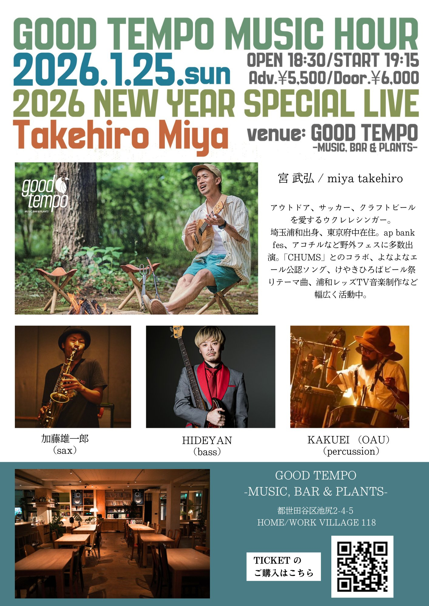 - 宮 武弘(vo.ukulele.MPC)加藤雄一郎(sax)HIDEYAN [Calmera](bass)KAKUEI [OAU](parcussion)