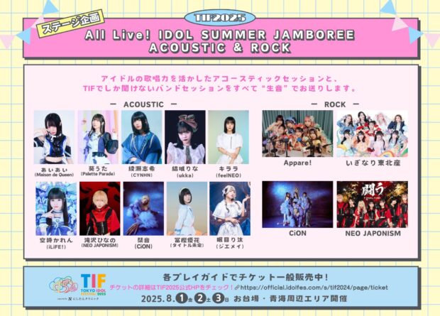CiON – TOKYO IDOL FESTIVAL 2025 Blog 2025.08.032025.11.27 『 Live! IDOL SUMMER JAMBOREE ACOUSTIC & ROCK』 日程┊︎2025年8月2日(土) ステージ┊︎SMILE GARDEN 時間┊︎19:40-20:40